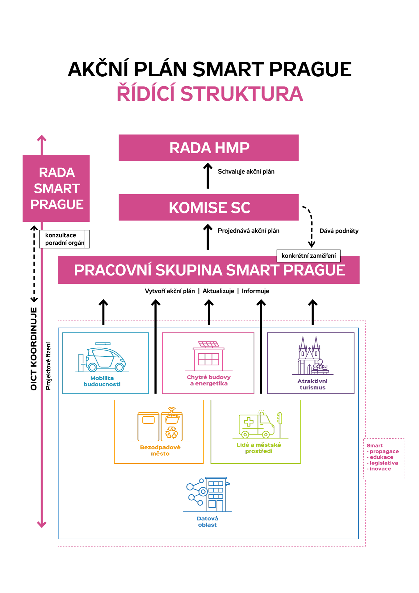 Řídicí struktura Akčního plánu Smart Prague 2030 slouží pro zajištění přípravy a schválení akčního plánu 2030 a následně pro vyhodnocování jeho naplňování a zajištění jeho aktualizace.
